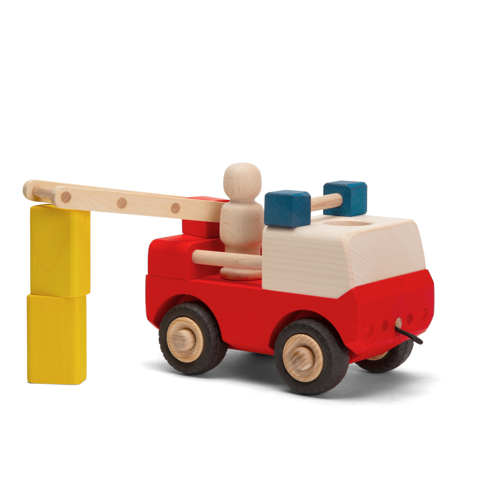 Spielzeugauto aus massivem Ahornholz und beweglichem Leiter. Kommt mit einer Figur und zwei Bausteinen aus Buche.