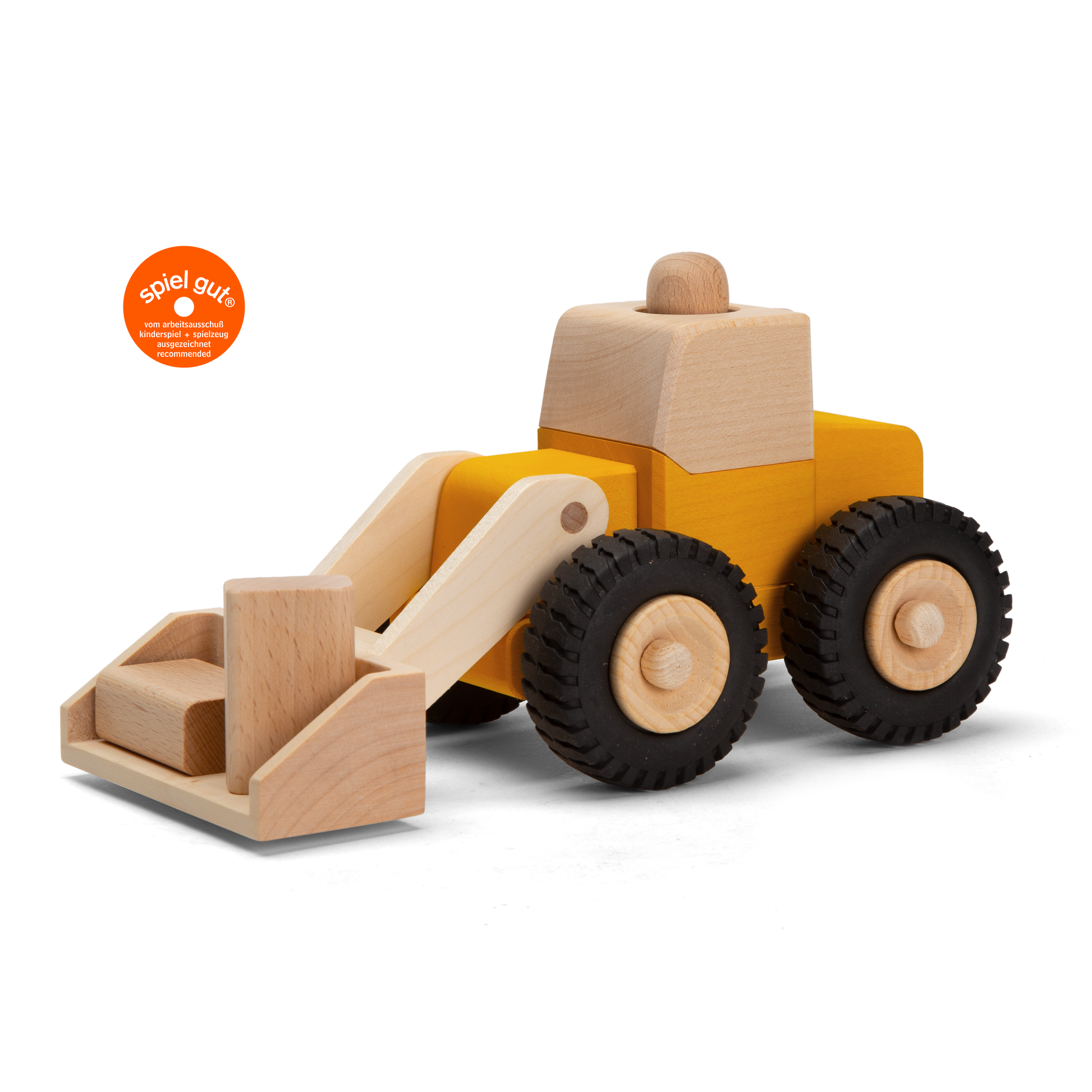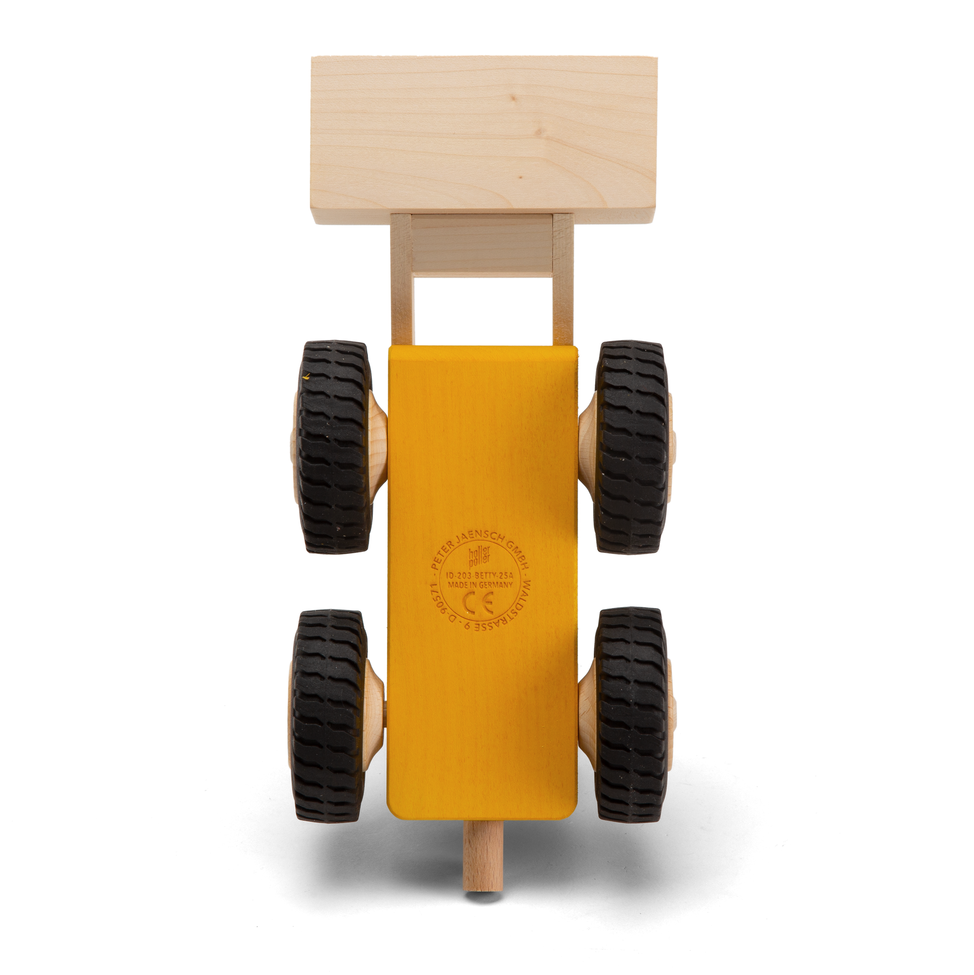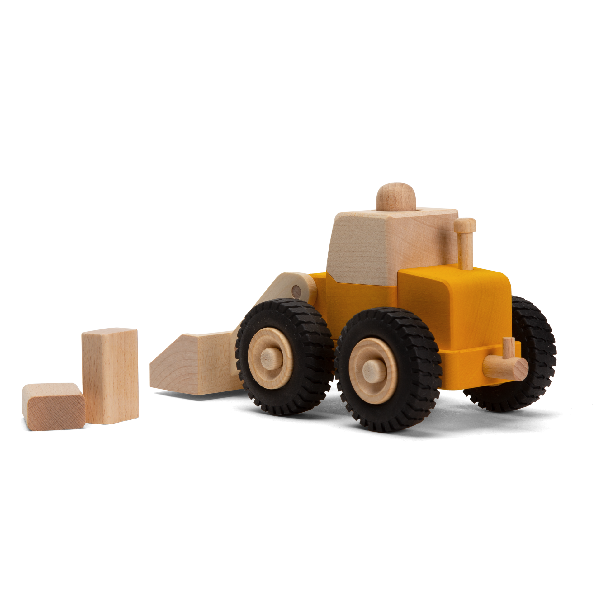 Spielzeug Baufahrzeug aus Ahorn mit Figur und zwei Bausteinen aus Buche.