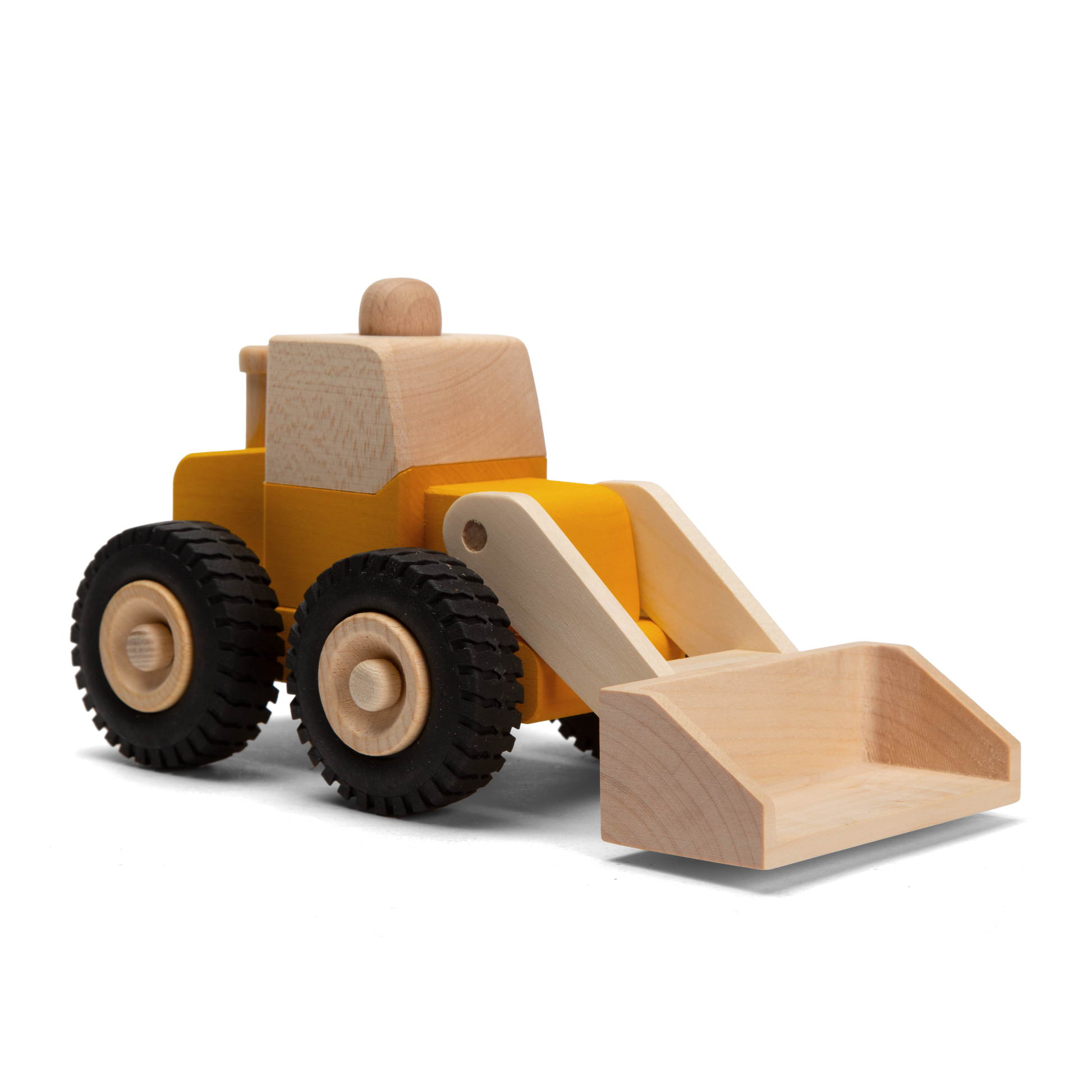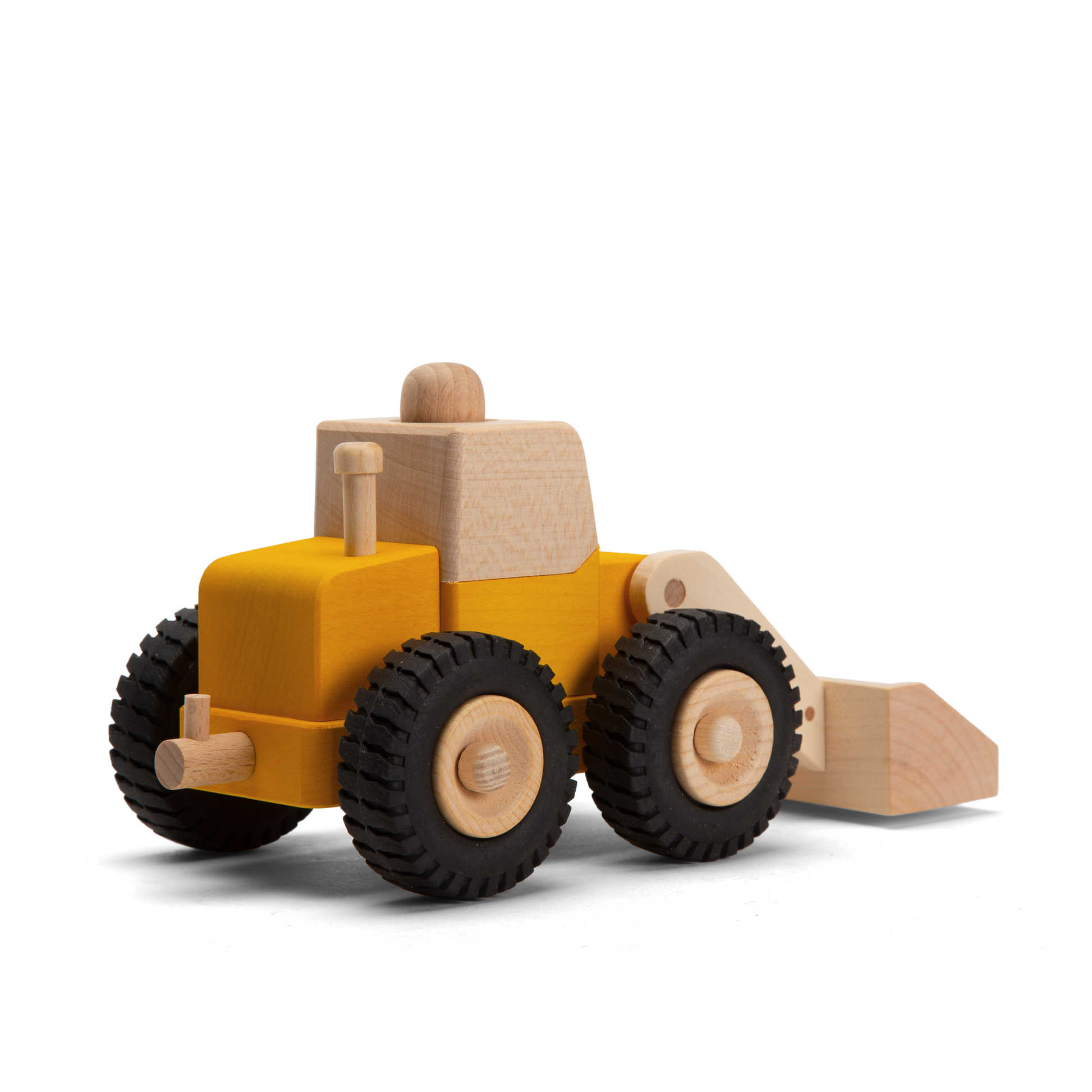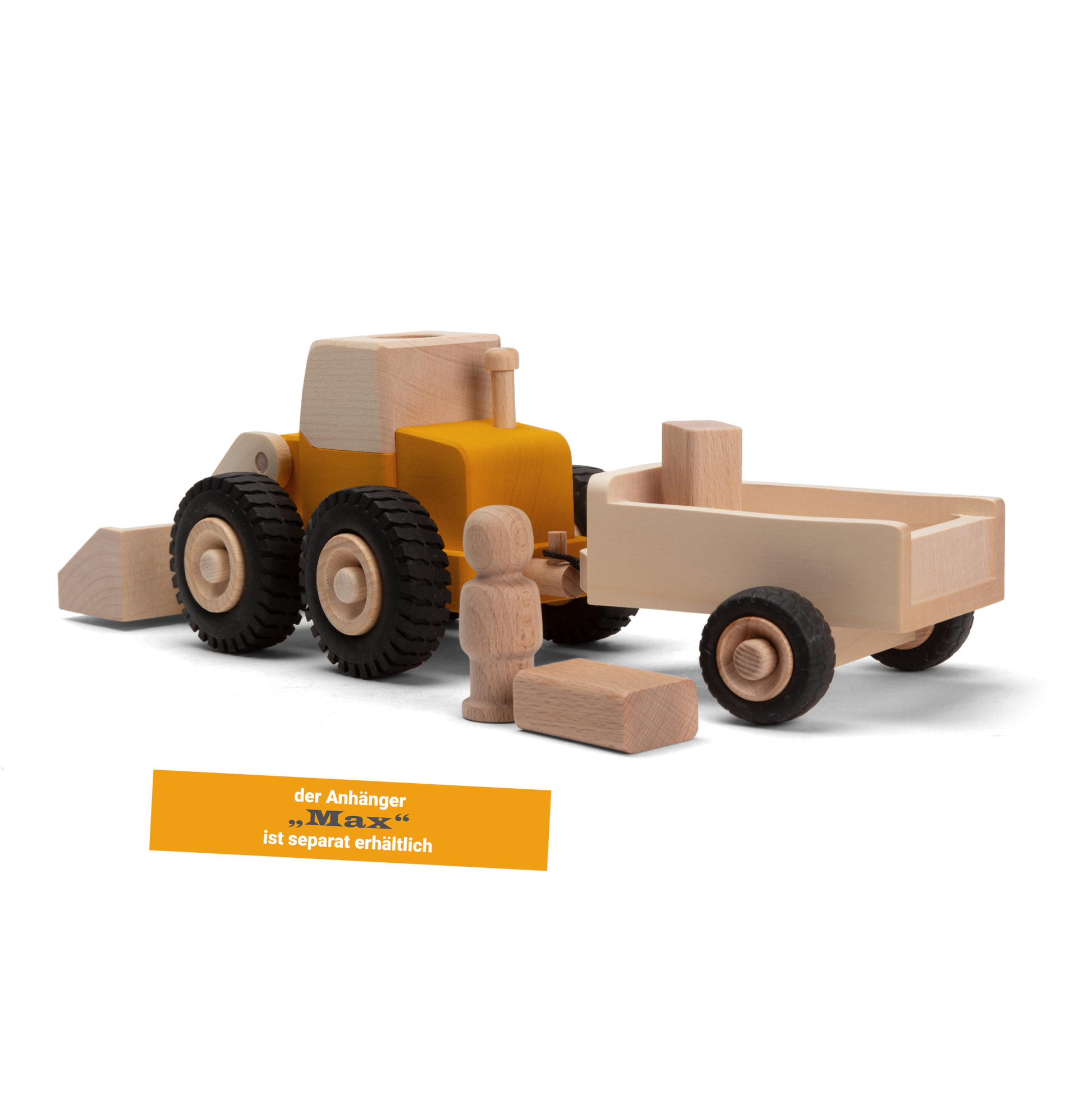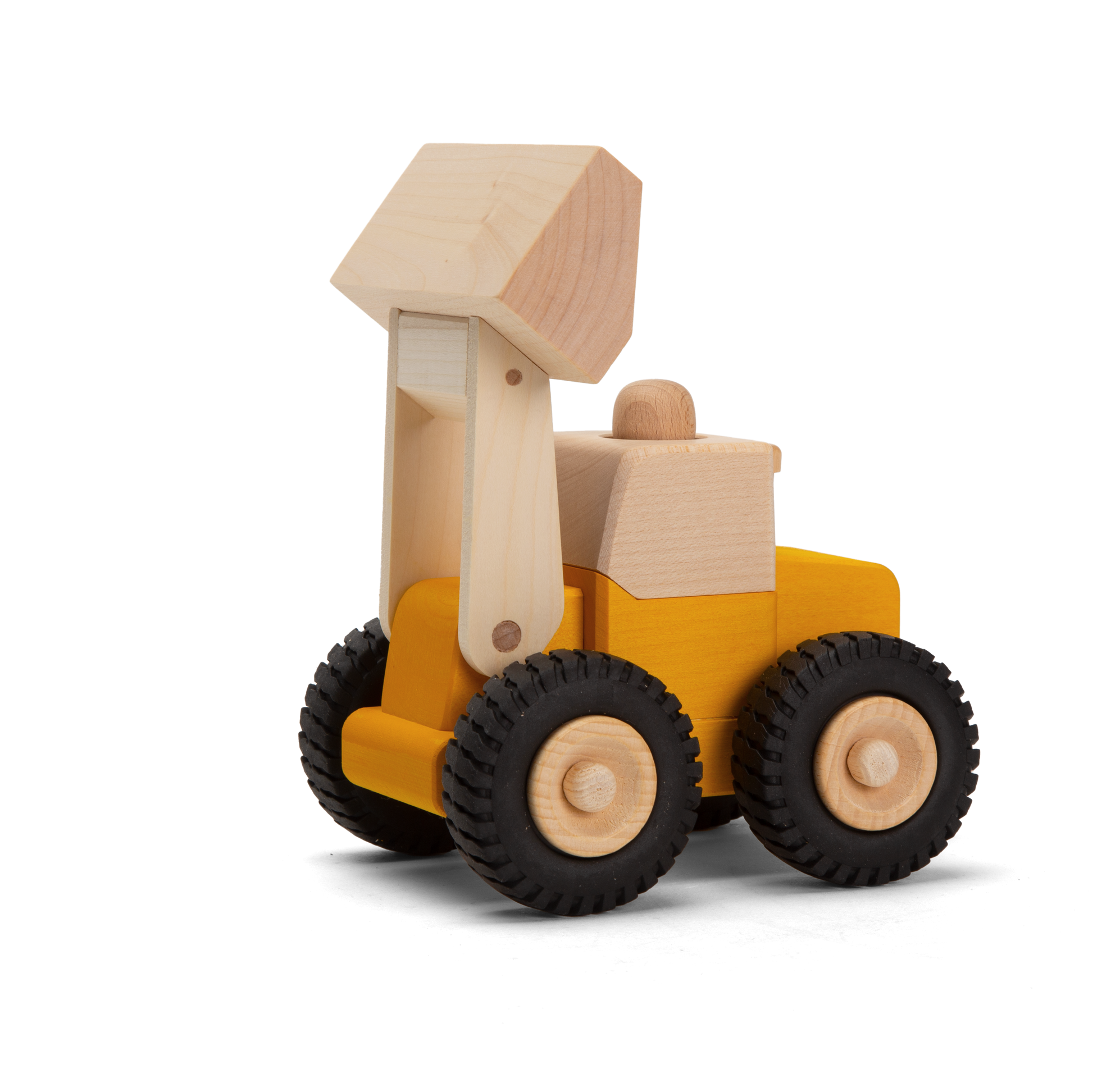 Spielzeug Baufahrzeug aus Ahorn mit Figur und zwei Bausteinen aus Buche.